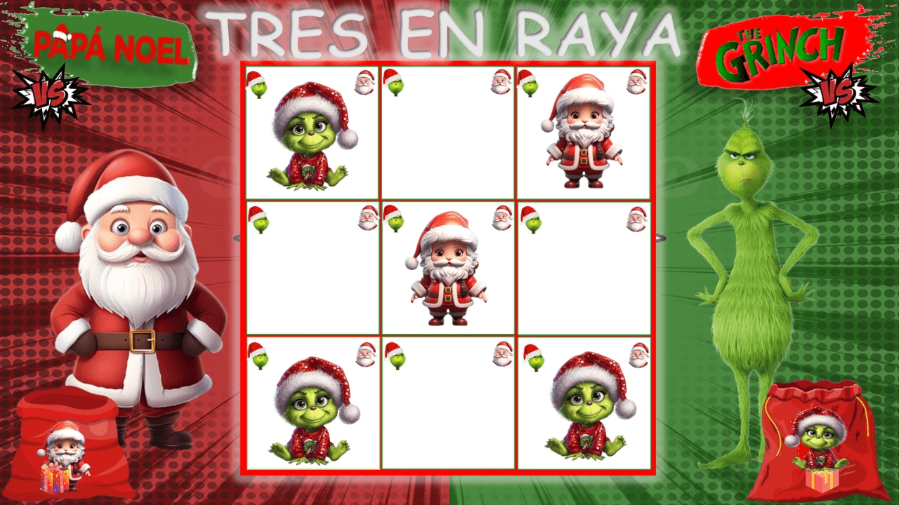 Jugamos al Tres en Raya con Papa Noel y el Grinch. ¿Quién de los dos se llevará los regalos de la Navidad?