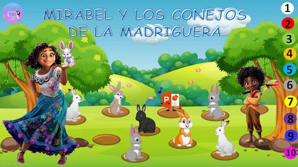 Cuento animado con actividades. Mirabel con la ayuda de Antonio tienen que contar y liberar a los conejos de la Madriguera.